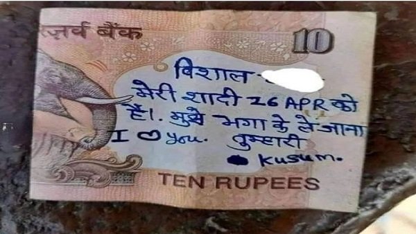 હાલમાં સોશિયલ મીડિયા પર એક 10 રૂપિયાની નોટ ખૂબ જ વાયરલ થઈ રહી છે. 10 રૂપિયાની નોટ એક વાર ફરીથી પ્રેમ કહાનીની સાક્ષી બની છે. આ વખતે કુસુમ નામની પ્રેમિકા પોતાના બૉયફ્રેન્ડ 'બિશાલ'ને નોટ પર એક મેસેજ લખીને મોકલી રહી છે. આ નોટ પર કુસુમ પોતાના પ્રેમી માટે ખાસ મેસેજ લખે છે. કુસુમ લખે છે - બિશાલ, મારા લગ્ન 26 એપ્રિલે છે. મને ભગાડીને લઈ જજે, લવ યુ. તારી કુસુમ.