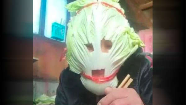 આ ફોટામાં તમે સ્પષ્ટ જોઈ શકો છો કે કેવી રીતે આ વ્યક્તિએ લેટેસ (કોબીજનો એક પ્રકાર)નુ માસ્ક પહેરેલુ છે.