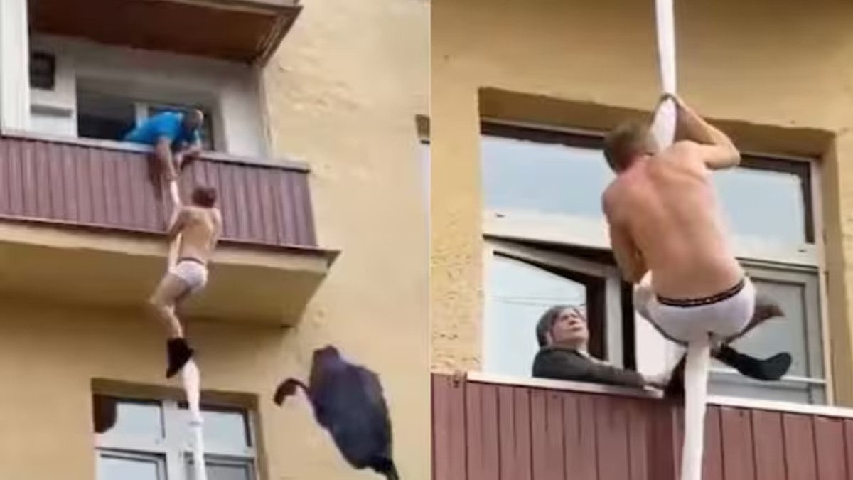 ટ્વિટર પર વાયરલ થઈ રહેલા આ વીડિયો એક યુવક અન્ડરવેરમાં બાલ્કનીમાંથી કૂદતો જોઈ શકાય છે. તે કપડાથી બનેલા દોરડાની મદદથી નીચે ઉતરવાનો પ્રયાસ કરી રહ્યો છે. લાગી રહ્યું છે કે પ્રેમી પોતાની પ્રેમિકા પાસે ગયો હશે. પછી તેના માતા-પિતા આવી જતા કપડાં પહેર્યા વગર જ ભાગવા લાગ્યો.