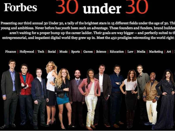 ફોર્બ્સની '30 વર્ષની નાની ઉંમરના 30 સૌથી સફળ યુવાનો' (30 અંડર 30)ની યાદીમાં 15 વિભિન્ના ક્ષેત્રોમાં સફળ યુવા સામેલ છે. જેમાં પોપ ગાયક જસ્ટિન બીબર, મિલી સાયરસ, ટેલર સ્વિફ્ટ, બ્લાગિંગ પ્લેટફોર્મ ટંબલરના સંસ્થાપક તથા મુખ્ય કાર્યકારી ડેવિડ કોર્પ, ટેનિસ ખેલાડી મારિયા શારાપોવા અને પાકિસ્તાની મહિલાઓના અધિકારીની તરફેણ કરનાર મલાલા યૂસૂજઇ સામેલ છે.