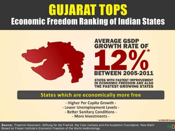ઇકોનોમિક ફ્રીડમ ઓફ સ્ટેટ ઓફ ઇન્ડિયાના 2013ના તાજા અહેવાલ અનુસાર, ગુજરાતે ઇકોનોમિક ફ્રીડમ ટેબલમાં 0.65ના સ્કોર સાથે પોતાના ટોચના ક્રમાંકને જાળવી રાખ્યો છે. ત્યાર બાદ બીજો નંબર તમિળનાડુનો છે, જો કે પહેલા અને બીજા ક્રમાક વચ્ચે મોટો ગેપ જોવા મળી રહ્યો છે. તમિળનાડુનો સ્કોર 0.54 છે. જ્યારે આ યાદીમાં બિહાર હજુ નીચલા ક્રમાંકે જ છે, પરંતુ તેમ છતાં નીતિશ કુમારે મુખ્યમંત્રી તરીકેનો ચાર્જ સંભાળ્યા બાદ આ રાજ્યમાં પ્રગતિ જોવા મળી રહી છે.