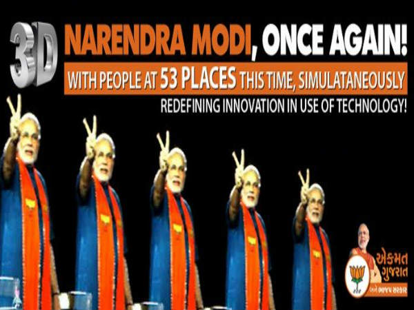 નરેન્દ્ર મોદી લોકસંપર્ક માટે નવી ટેકનોલોજીનો બહોળા પ્રમાણમાં ઉપયોગ કરવા માટે જાણીતા છે. આ બાબત હવે દુનિયા પણ માનવા લાગી છે. ગુજરાત વિધાનસભા ચૂંટણી 2012 દરમિયાન નરેન્દ્ર મોદીએ એક સાથે અનેક લોકો સુધી પહોંચવા માટે થ્રીડી ટેક્નોલોજીનો ઉપયોગ કર્યો હતો. નરેન્દ્ર મોદીના થ્રીડી ભાષણોને ગિનિસ બૂક ઓફ વર્લ્ડ રેકોર્ડ્સમાં સામેલ કરવામાં આવ્યા છે. મોદીએ પાંચ દિવસમાં 3ડી ટેકનોલોજી થકી 106 સભા સંબોધી હતી.