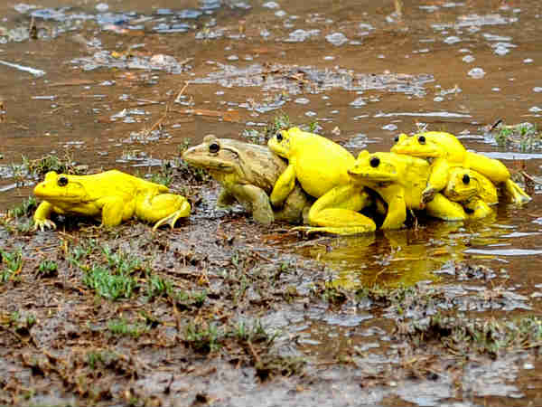 આ રંગના દેડકા આપણે ત્યાં જવલ્લે જ જોવા મળે છે. વરસાદી પાણીમાં તેઓ એકબીજા સાથે મસ્તી કરી રહ્યા છે.