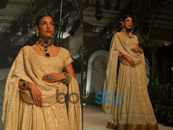ભારેભરખમ ઇયરિંગ, હાર, માંગનો ટીકો અને નાકની બાલી ખુબસુરત હોવાની સાથે અવધની સંસ્કૃતિને પણ દર્શાવી રહી હતી. બ્રાઇડલ ફેશન વીકમાં મેલ મોડલ્સે પણ મોતીના હાર પહેરી રાખ્યાં હતા. આ દેખાવે સિમ્પલ પણ હતા અને પરંપરાગત પણ. તો ચાલો તસવીરો થકી જોઇએ, મીરા, મુઝફ્ફર અલી કલેક્શનમા બીજા દિવસે શું રજૂ કરવામાં આવ્યું.