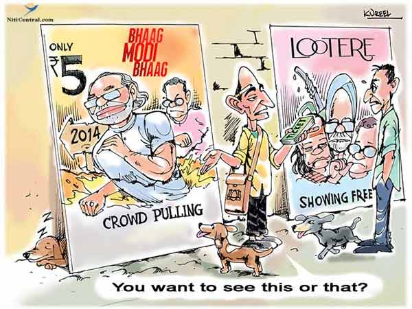 નીતિ સેન્ટ્રલના કાર્ટૂનિસ્ટ મનોજ કુરીલે આ કોંગ્રેસ અને બીજેપીની હાલની પરિસ્થિતિને ચિતરતું સરસ કટાક્ષભર્યું કાર્ટૂન દોર્યું છે. જેને જોઇને આપને જરૂર હસુ આવી જશે. પોતાના કાર્ટૂનમાં તેમણે કોંગ્રેસની યુપીએ સરકારને 'લુટેરા'ઓની પાર્ટી ગણાવી છે, જ્યારે બીજેપી તરફથી મોદીને પીએમ પદ માટે 'ભાગ મોદી ભાગ' કહેવામાં આવ્યું છે. તમે જ જુઓ આ કાર્ટૂન અને આપો આપનો પ્રતિભાવ...