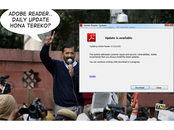 કેજરીવાલ એડોબ રીડરના અપડેટ રોકવા માટે ધરણા કરવાનું શરૂ કરી દેતા અને કહેતા એડોબ તમે સાંભળી રહ્યા છો અમે હેરાન થઇ ગયા છીએ, જેવું કમ્પ્યુટર ઓન કરીએ છીએ અપડેટ સૂચના આવી જાય છે.