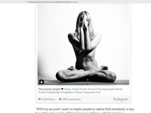 સામાન્ય રીતે ઇન્સટ્રાગામે નગ્નતા પર રોક લગાવીને રાખી છે. પણ હાલમાં જ ઇન્સટ્રાગામ પર સક્રિય થયેલી એક અજાણી મહિલાએ નિવસ્ત્ર થઇને યોગા કરેલી પોતાની તસવીરો ઇન્સટ્રાગ્રામ પર મૂકી છે. જેને ઇન્સટ્રાગ્રામ પણ હટાવી નથી શક્યું.કારણ કે આ તસવીરોમાં અશ્લીતા નહીં પણ ક્રિએટીવીટી છે.