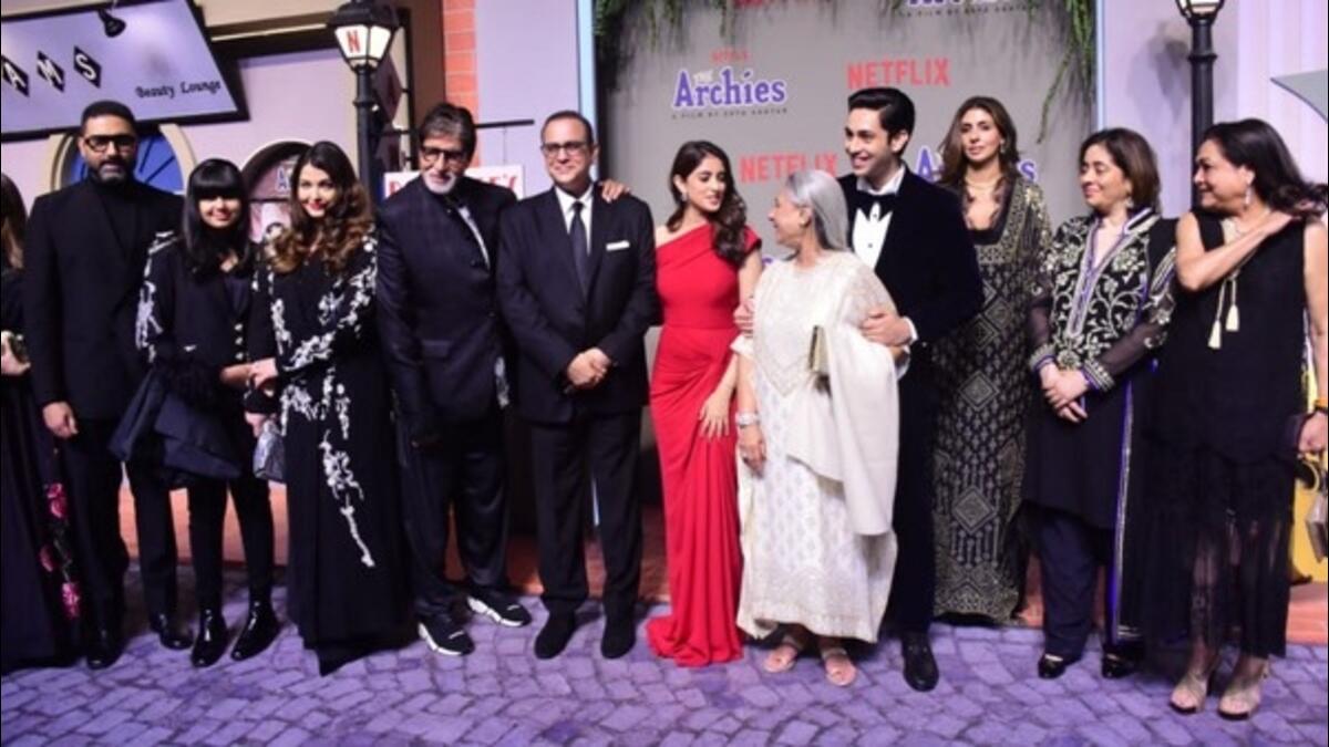 સમગ્ર બચ્ચન પરિવાર ફિલ્મ ધ આર્ચીઝના સ્ક્રીનિંગમાં સાથે જોવા મળ્યો હતો અને તેઓએ પાપારાઝી માટે જોરદાર પોઝ પણ આપ્યા હતા. ઝોયા અખ્તરની ફિલ્મ ધ આર્ચીઝની સ્ક્રીનિંગમાં ઐશ્વર્યા રાય તેના આખા સાસરિયાં સાથે જોવા મળી હતી. આ ખાસ પ્રસંગની ઘણી તસવીરો અને વીડિયો સોશિયલ મીડિયા પર વાયરલ થઈ રહ્યા છે.