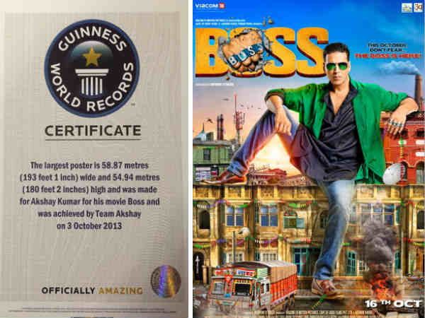 બૉસ ફિલ્મના આ પોસ્ટરની પહોળાઈ 193 ફુટ ને 1 ઇંચ, જ્યારે લંબાઈ 180 ફુટ ને 2 ઇંચ છે. અક્ષયના ફૅન્સના જૂથ અક્ષય ટીમે આ પોસ્ટર બનાવ્યું છે. ગત 3જી ઑક્ટોબરના રોજ બ્રિટનના લિટલ ગ્રૅંસ્ડેન ઍરફીલ્ડ ખાતે આ પોસ્ટરનું અનાવરણ થયું. આ પોસ્ટર બનાવતા ચાર માસનો સમય લાગ્યો.