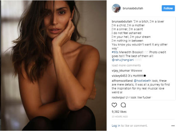 આથી જ કદાચ બ્રૂનાએ આ ફોટો સાથે ખૂબ જ સૂચક મેસેજ લખ્યો છે. તેણે લખ્યું છે, હું ચૂડેલ છું, હું પ્રેમિકા છું, હું બાળકી છું, હું માં છું, હું પાપી છું, હું સંત છું, પણ મને આ વાતની શરમ નથી. હું તારું સ્વર્ગ છું, હું તારું નરક છું. પરંતુ વચ્ચે ક્યાંય નથી. આથી તને ખબર છે કે હું તને અન્ય કોઇ રૂપમાં કેમ નહીં મળું.