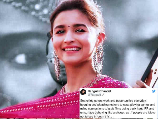 હાલમાં જ આલિયા ભટ્ટે મઝાની ઘટના શેર કરતા કહ્યુ કે એક દિવસ રાજામૌલી તેમને એરપોર્ટ પર મળ્યા અને તેણે તેમની પાસે ભીખ માંગી કે પોતાની આગામી ફિલ્મમાં તેને કામ આપી દે. પરંતુ આલિયાએ જે અંદાજમાં આ વાત કહી હતી તેને ખબર નહોતી કે આ પાછુ તેના માથાનો દુઃખાવો બની જશે. હવે આને પકડીને બેસી ગઈ છે કંગના રનોતની બહેન રંગોલી ચંદેલ. એક ટ્વીટ કરીને રંગોલીએ કહ્યુ કે રોજ બીજાના કામ છીનવવા, મોટા પ્રોડ્યુસર પાસેથી ફિલ્મોની ભીખ માંગવી, તેમની આગળ પાછળ ફરવુ, પોતાના કનેક્શનના ઉપયોગ કરીને બીજાની ફિલ્મ પોતાના નામે કરી લેવા અને સામે એવુ બતાવવુ કે જાણે કંઈ થયુ જ નથી. પરંતુ જોનારા મૂર્ખા નથી.