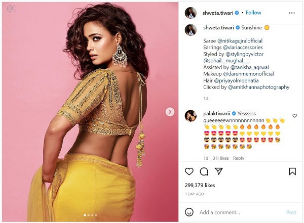 સાડીનો પલ્લુ સરકાવીને ફોટોશૂટ કરવામાં આવ્યું છે, આ ફોટોશૂટ તેના પૂર્વ પતિ રાજા ચૌધરીને પણ તે કહેવા મજબુર કર્યુ જે તે લાંબા સમયથી ભૂલી ગયો હતો. શ્વેતાની તસવીર પર રાજાએ લખ્યું, હંમેશાની જેમ સુંદર.