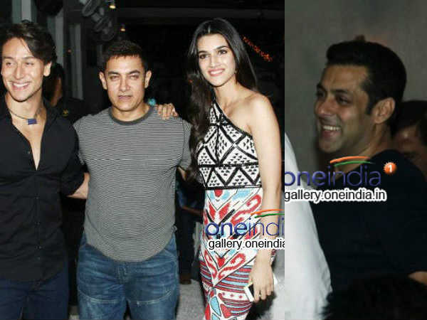 હીરોપંતીની સક્સેસ પાર્ટીમાં ટાઇગર શ્રૉફ અને કૃતિ સૅનન સાથે આમિર ખાન.