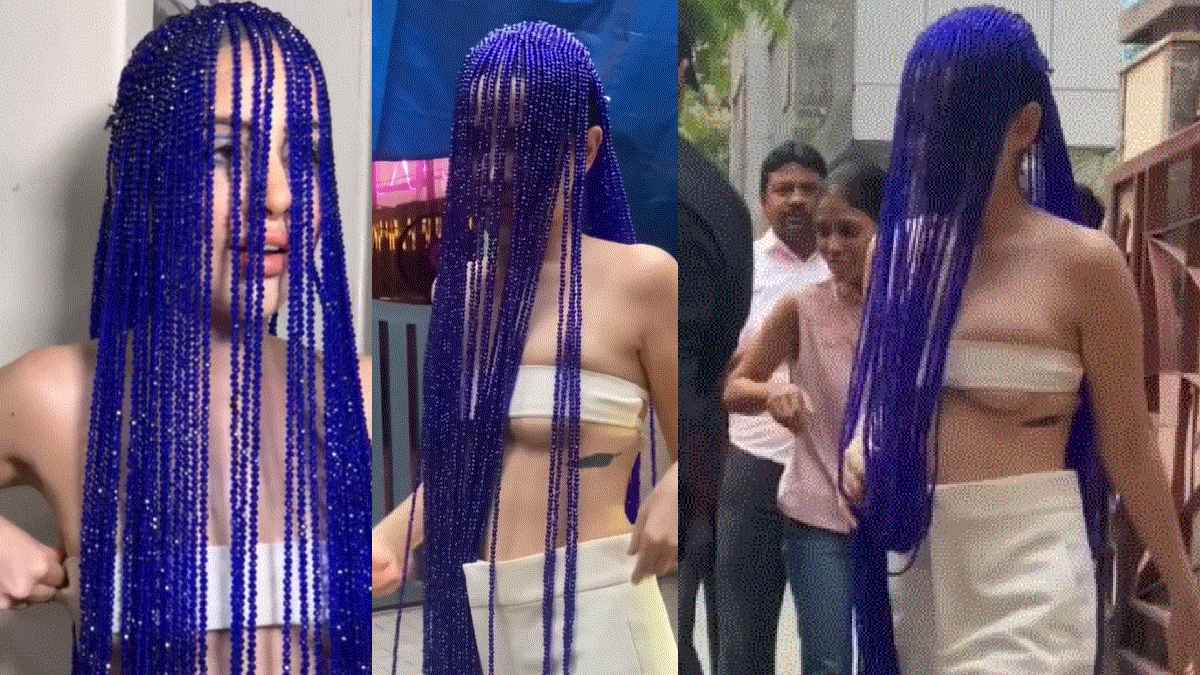 વીડિયોમાં જોઈ શકાય છે કે ઉર્ફી જાવેદના વાદળી રંગના વાળ જમીન સુધી આવી રહ્યા છે. આ ઉપરાંત તેણે શરીરને માત્ર ઉપરની બાજુએથી સ્હેજ ઢાંકવા માટે સફેદ પટ્ટીનો ઉપયોગ કર્યો છે.