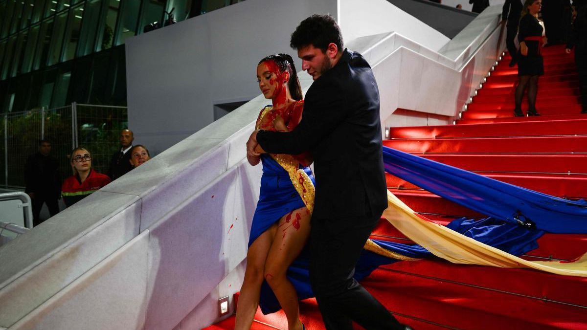 At the Cannes Film Festival, a brave young lady dressed in the colors of Ukraine doused herself in fake blood. She did it on the red carpet before the screening of the Russian film "Acid". The security service quickly ran up to her and rushed her away. 🇺🇦💙💛… pic.twitter.com/rqx2CNlJ0N