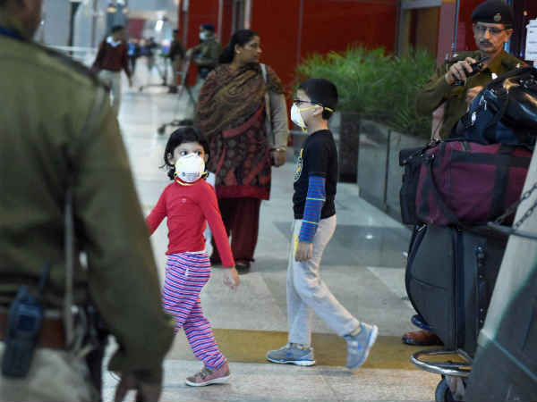 બે બાળકો સ્વાઇન ફ્લુથી બચવા માટે માસ્ક પહેરીને જીઆઇજીમાં જઇ રહ્યા છે.