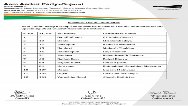 આમ આદમી પાર્ટીએ ઉમેદવારોની 11 મી યાદીમાં 12 નામોની કરી જાહેરાત