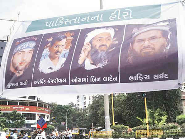 દિલ્હીના મુખ્યમંત્રી અરવિંદ કેજરીવાલે ગુજરાતમાં આજે સાંજે આવશે. પણ તે પહેલા તેમની વિરુદ્ધ સુરત અને રાજ્યભરમાં પોસ્ટર વોર શરૂ થઇ ગયું છે. સુરતમાં જ લગાવવામાં આવેલા એક પોસ્ટરમાં કેજરીવાલને ઓસામા બિન લાદેન, હાફિઝ સઇદ અને બુરહાન વાની સાથે બતાવવામાં આવ્યા છે અને ઉપર લખવામાં આવ્યું છે કે તે પાકિસ્તાનના હિરો છે.