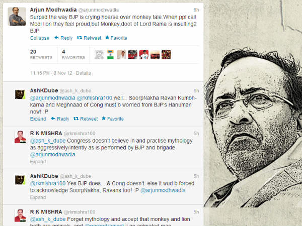 અમદાવાદ, 9 નવેમ્બર: ગુજરાતના મુખ્યમંત્રી નરેન્દ્ર મોદીની તુલના વાંદરા સાથે કરનાર ગુજરાત કોંગ્રેસના પ્રદેશ પ્રમુખ અર્જુન મોઢવાડિયાએ ટ્વિટ કર્યું છે કે ' નરેન્દ્ર મોદીની સરખામણી વાંદરા સાથે કરવાથી ભારતીય જનતા પાર્ટીને માઠૂં કેમ લાગી રહ્યું છે? વાંદરાઓ તો રામના દૂત હતા. ભાજપને રામના દૂતથી આટલો વાંધો કેમ?'