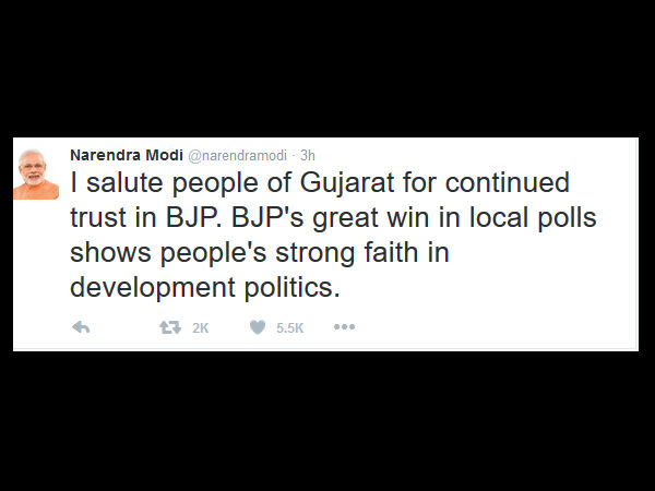 વડાપ્રધાન નરેન્દ્ર મોદીએ સ્થાનિક સ્વરાજ્યની ચૂંટણીમાં ભાજપની અદ્ઘભૂત જીત બાદ ગુજરાતની જનતાનો આભાર માન્યો છે. અને જણાવ્યું છે કે લોકો ખાલી વિકાસના રાજકારણમાં વિશ્વાસ કરે છે.