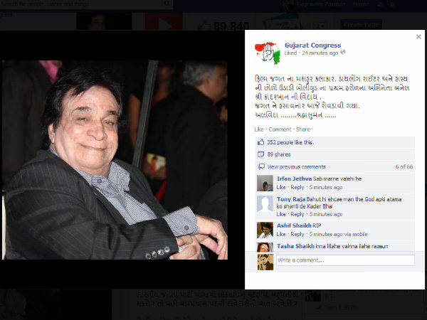 ગુજરાત કોંગ્રેસ પ્રદેશ સમિતિએ પોતાના સોશિયલ સાઇટ્સ ફેસબુકના એકાઉન્ટ પર કાદર ખાનના નિધન અંગે સંદેશો આપતા લખ્યું કે "ફિલ્મ જગતના મશહુર કલાકાર, ડાયલોગ રાઇટર અને હાસ્યની છોળો ઉડાડી બોલીવુડના પ્રથમ હરોળના અભિનેતા બનેલ શ્રી કાદરખાનની વિદાય. જગતને હસાવનાર આજે રોવડાવી ગયા. અલવિદા..... શ્રદ્ધાસુમન....."