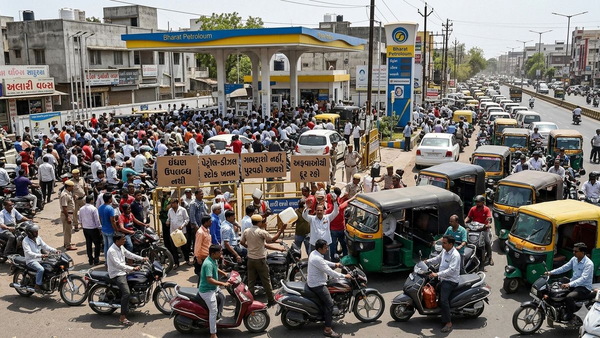 ગુજરાતમાં હાલ ઇંધણની ભારે અછત હોવાની ચર્ચાઓએ જોર પકડ્યું છે, જેના કારણે રાજ્યના મુખ્ય શહેરોમાં પેટ્રોલ પંપો પર લાંબી કતારો જોવા મળી રહી છે. સરકારે જનતાને શાંતિ જાળવવા અને ગભરાટમાં આવી ખરીદી ન કરવા વારંવાર વિનંતી કરી છે, છતાં પણ લોકોમાં ભયનો માહોલ યથાવત જોવા મળી રહ્યો છે.