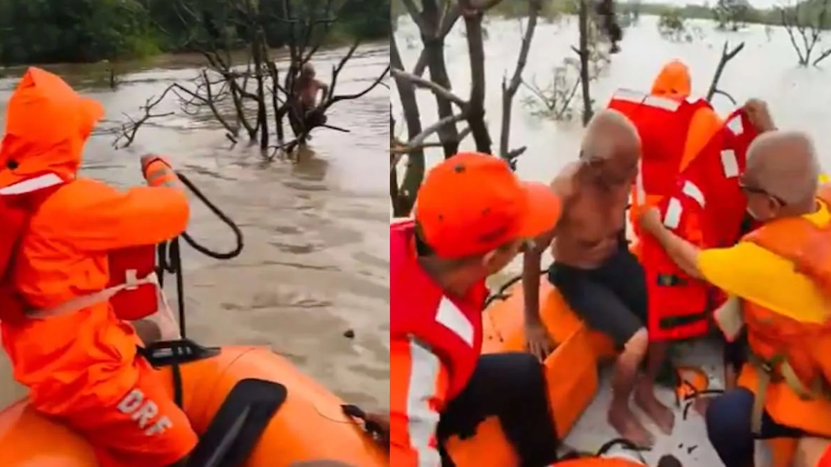 પાણીનો પ્રવાહ એટલો ઝડપી હતો કે વૃક્ષ ગમે ત્યારે ઉખડીને શકે તેમ હતું અને વ્યક્તિ પોતાનો જીવ બચાવવા માટે તેને પકડીને ફસાયો હતો. NDRFનું ધ્યાન વ્યક્તિ પર પડતા તેને સફળતાપૂર્વક બચાવી લેવામાં આવ્યો છે.