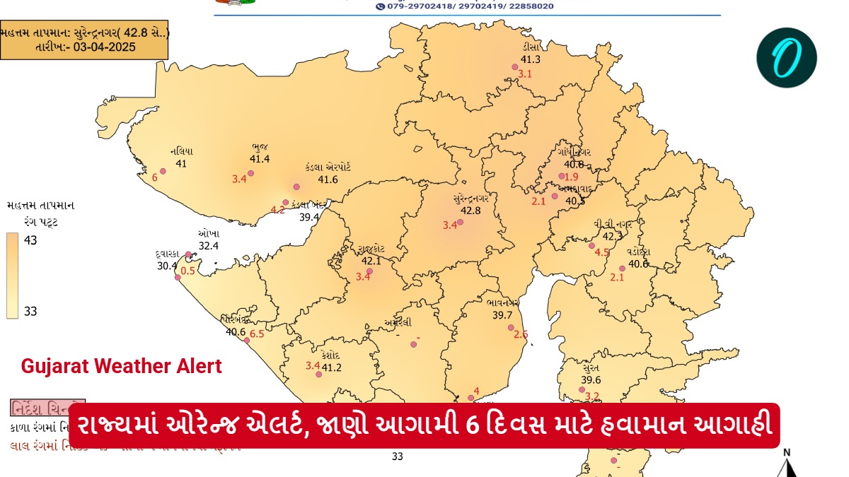 હવામાન વિભાગે આગામી છ દિવસ માટે ઊંચા તાપમાનની આગાહી કરી છે. ખાસ કરીને કચ્છ-સૌરાષ્ટ્ર અને ઉત્તર ગુજરાતના પ્રદેશો માટે 8 એપ્રિલ 2025 સુધી ગરમીના મોજાની સ્થિતિ માટે ઓરેન્જ અને યલો એલર્ટ જાહેર કરવામાં આવ્યું છે.