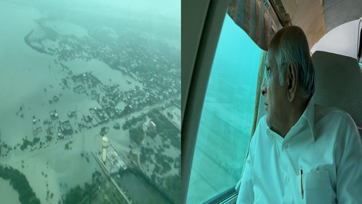 #WATCH | Gujarat CM Bhupendra Patel conducts an aerial survey of the flood-affected areas in Devbhumi Dwarka district.