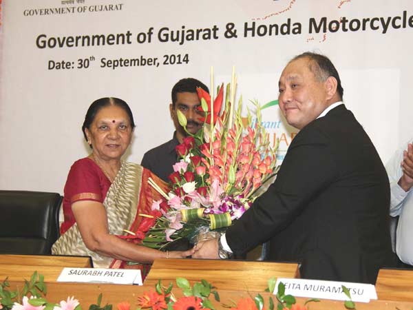 મુખ્યકમંત્રીએ ગુજરાતમાં પ્લાઆન્ટ શરૂ કરવાના હોન્ડાવ સ્કુ ટર્સ એન્ડમ મોટર સાયકલ્સટના આ નિર્ણયને 'ગુજરાત ઓટો હબ'ની દિશામાં વધુ એક સિમાચિન્હો ગણાવ્યું હતું. આનંદીબહેને કહ્યું કે, આવા ઉત્પાંદન એકમો દ્વારા 'મેઇક ઇન ઇન્ડિયા'ની વડાપ્રધાન નરેન્દ્ર મોદીની સંકલ્પ્ના સાકાર થશે. મુખ્યનમંત્રીએ વિઠ્ઠલાપૂર-સાણંદ-બેચરાજીના ક્ષેત્રમાં ઊદ્યોગો ધમધમતા થતાં રોજગારી અવસર સાથે જ નર્મદા કેનાલ નેટવર્કથી પાણી પહોંચતા કૃષિ-પશુપાલન વિકાસ થતાં સમગ્ર ક્ષેત્રનો ત્રિસ્તદરીય વિકાસ થશે તેનો આનંદ વ્યક્ત કર્યો હતો.