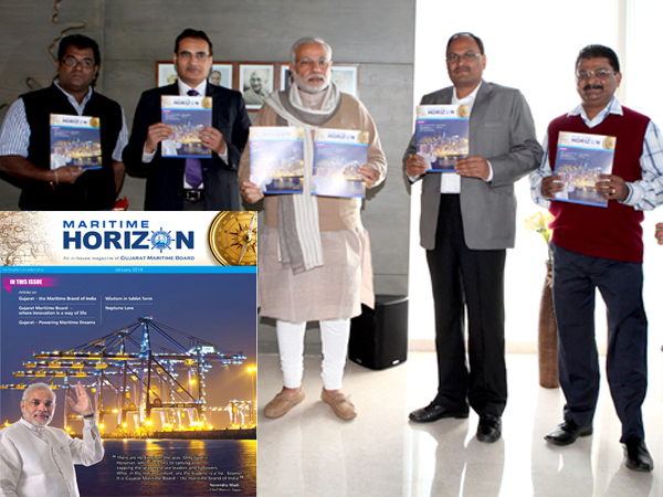 ગાંધીનગર, 30 જાન્યુઆરી: ગુજરાતના મુખ્યમંત્રી અને ભાજપ તરફથી વડાપ્રધાન પદના ઉમેદવાર નરેન્દ્ર મોદીએ બુધવારે ગુજરાત મેરીટાઇમ બોર્ડ દ્વારા પ્રકાશિત મેરીટાઇમ હોરાઇઝોન (ઇનહાઉસ મેગેઝીન)નું વિમોચન કર્યું હતું.
