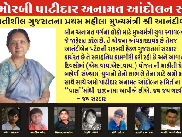 પાટીદારોના અનામત આંદોલનના ગઢ મનતા મોરબીમાં પાસના કાર્યકર્તાઓએ પાસમાંથી રાજીનામાં આપી મુખ્યમંત્રી આનંદીબેનને ટેકો જાહેર કર્યો છે. આ પાટીદારોએ મુખ્યમંત્રી આનંદીબેનના સુવર્ણોના પેકેઝને વધાવીને અનામત આંદોલનમાંથી પાછી પાની કરી છે.