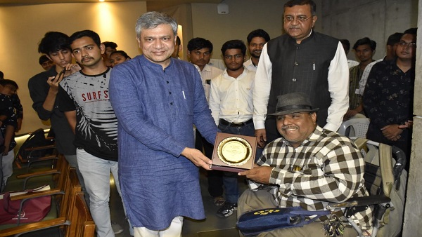 ડિજિટલ વીક-૨૦૨૨ની ઉજવણી અંતર્ગત ગુજરાતની મુલાકાતે આવેલા કેન્દ્રીય રેલવે, આઈ.ટી અને ઇલેક્ટ્રોનિક મંત્રીશ્રી અશ્વિની વૈષ્ણવે ઈડીઆઈઆઈ કેમ્પસ, ભાટ ખાતે આજે વિવિધ સ્ટાર્ટઅપ્સ સાથે સંવાદ કર્યો હતો તથા વિવિધ ક્ષેત્રના પાંચ જેટલા સ્ટાર્ટઅપને સન્માનિત કર્યા હતા. દરમિયાન, દિવ્યાંગો માટે વ્હીલચેર સ્કૂટરનું સ્ટાર્ટઅપ શરૂ કરનારા જિજ્ઞેશ શાહ નામના દિવ્યાંગ આંત્રપ્રિન્યોર સન્માન સ્વીકારવા માટે સ્ટેજ સુધી પહોંચી શકે તેમ ન હોવાનું ધ્યાને આવતા, મંત્રીશ્રી સંવેદનશીલ અભિગમ દાખવીને હોલની બહાર દોડી ગયા હતા અને રૂબરૂ જઈને તેમનું સન્માન કર્યું હતું.