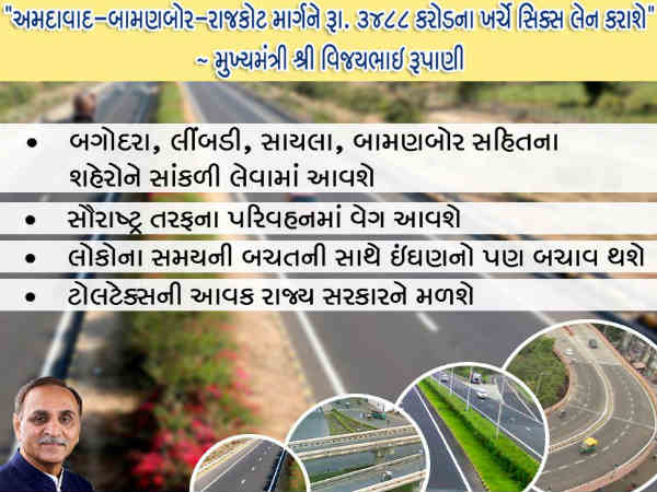 મુખ્યમંત્રી વિજયરૂપાણી આ અંગે જણાવતા કહ્યું કે આ સિક્સ લેન હાઇવેના બનવાથી બગોદરા, લીંબડી, સાયલા, બામણબોર જેવા શહેરાને સાંકળવામાં આવશે. સાથે જ સૌરાષ્ટ્ર તરફના પરિવહનમાં પણ આ સિક્સ લેન હાઇવેના કારણે વેગ આવશે. સાથે જ તેમણે જણાવ્યું કે આ દ્વારા લોકોના સમય સાથે ઇંધણનો પણ બચાવ થશે. જો કે સિક્સ લેન થતા જ ટોલટેક્સની આવક પણ રાજ્ય સરકારને મળશે. ત્યારે આ 201 કિમી લાંબા હાઇવે માટે સરકાર અંદાજે 3488 કરોડ ખર્ચશે.
