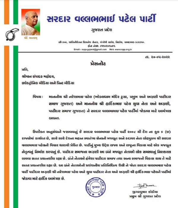 SVPP એટલે કે સરદાર વલ્લભભાઈ પટેલ પાર્ટીના પ્રમુખ જીગરકુમાર કોઠિયાએ પત્ર લખીને હાર્દિક પટેલને પાર્ટીમાં જોડાવા માટે આમંત્રણ મોકલ્યુ છે. જો કે હાર્દિક તરફથી મુદ્દે હજુ કોઈ પ્રતિક્રિયા મળી નથી. બીજી તરફ સવાલ એ પણ છે રે હાર્દિક આ પાર્ટીમાં જોડાશે કે કેમ?