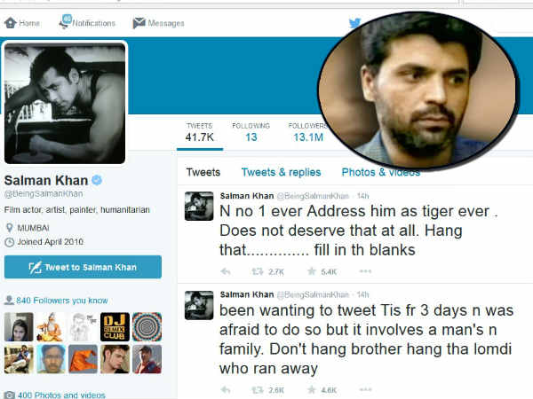 ટ્વિટમાં સલમાન ખાને કહ્યું હતું કે ટાઇગરને ફાંસી આપો. ટાઇગરના કારણે કરીને તેના ભાઇને ફાંસી આપવામાં આવી રહી છે. ટાઇગર ક્યાં છે? ટાઇગરને પકડો, ટાઇગરને ફાંસી આપો. ટાઇગર એક ડરપોક છે. તેના ભાઇને નહીં. ક્યાં છુપાઇને બેઠો છે ટાઇગર. તે ટાઇગર નથી એક બિલાડી છે એક બિલાડીને નથી પકડી શકતા.