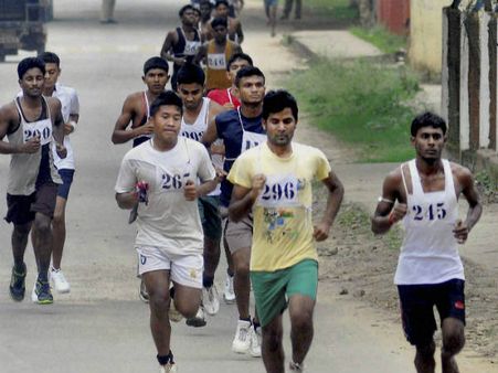 સોમવારે, ગુવાહાટીમાં કેન્દ્રીય ઔદ્યોગિક સુરક્ષા દળ (CISF)ની ભરતી રેલીમાં દોડની પરીક્ષા આપી રહેલા યુવાનો.