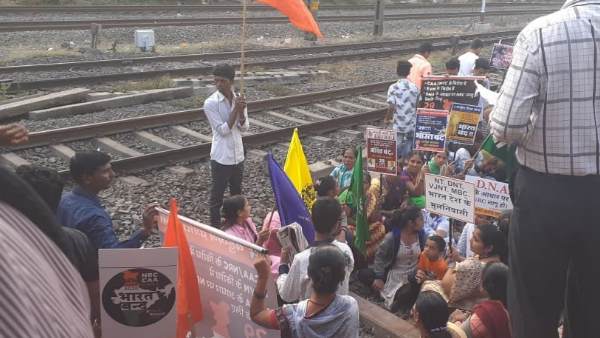 Mumbai: Members of Bahujan Kranti Morcha block a railway track in Kanjurmarg station during a protest against #CitizenshipAmendmentAct and #NationalRegisterofCitizens . The organization has called for a 'Bharat Bandh' today. pic.twitter.com/1aVpEyh3Ot