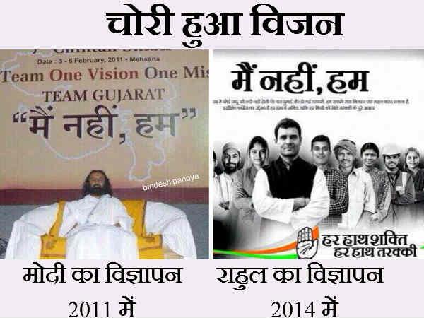 હા અમે રાહુલની એ જાહેરાતની વાત કરી રહ્યા છીએ, જે આજે દેશભરના સમચારપત્રોમાં છપાયું છે. આ જાહેરાતમાં મોટા મોટા અક્ષરોમાં છપાયું છે કે 'મે નહી હમ'. જાહેરાત જોતા જ ભારતીય જનતા પાર્ટીના કાર્યકર્તાઓએ કોંગ્રેસ ઉપાધ્યક્ષ રાહુલ ગાંધીની એવું કહીને મજાક ઉડાડવાની શરૂ કરી દીધી રાહુલ ગાંધીએ મોદીના વિઝનની ચોરી કરી છે.