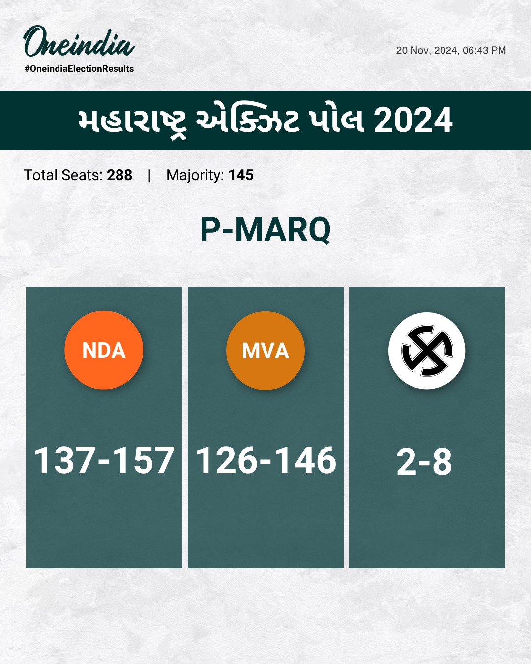 PMARQ એક્ઝિટ પોલ અનુસાર, મહાયુતિ ગઠબંધનને 137 અને 157 બેઠકો મળવાનો અંદાજ છે, જ્યારે મહા વિકાસ અઘાડીને 126 અને 146 બેઠકો વચ્ચે જીતનો અંદાજ છે. અન્ય પક્ષોને 2 થી 8 બેઠકો મળી શકે છે.