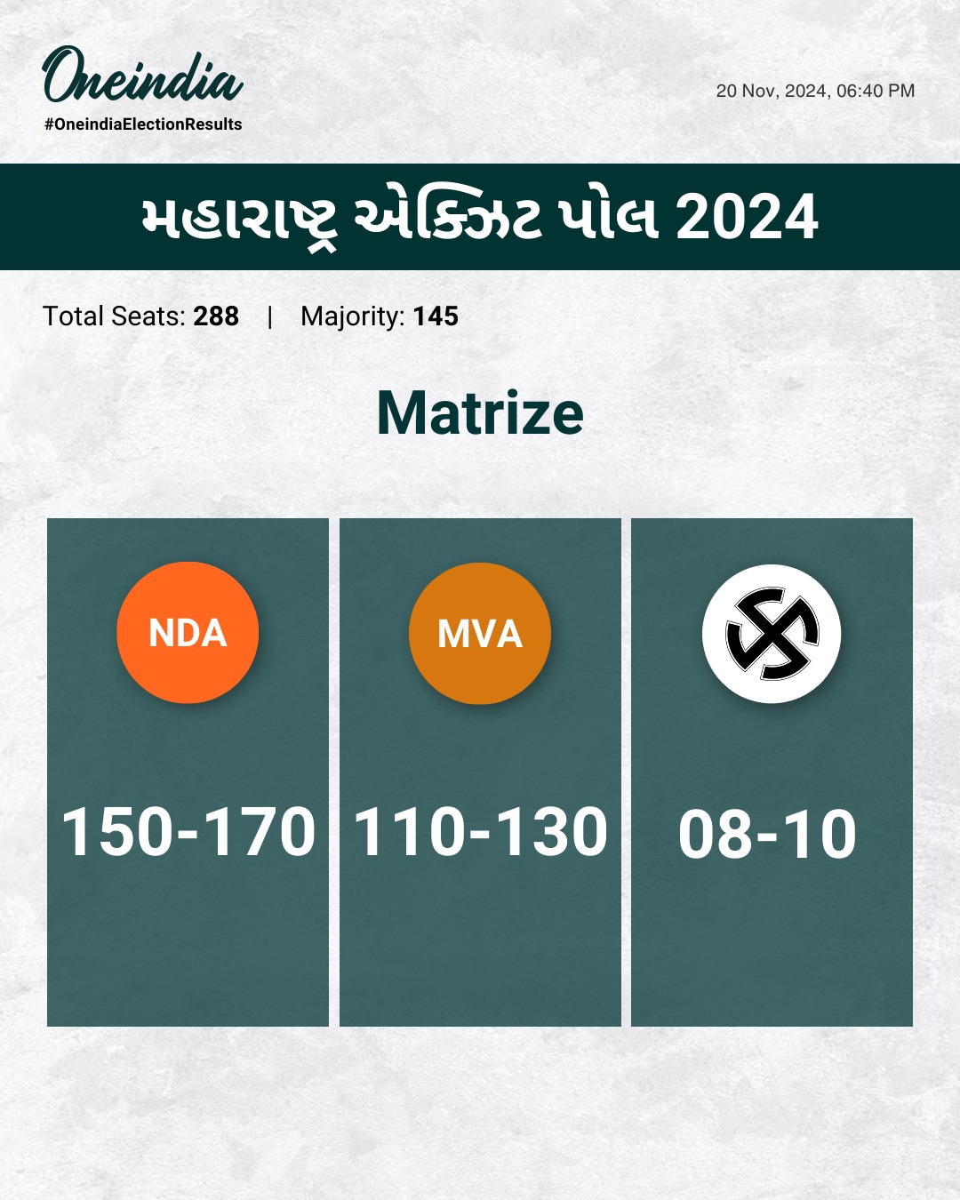 MATRIZE એક્ઝિટ પોલ પ્રકાશિત કરવામાં આવ્યો છે, જેમાં આગાહી કરવામાં આવી છે કે ભાજપ ગઠબંધન મહારાષ્ટ્રમાં 150 થી 170 બેઠકો મેળવે તેવી શક્યતા છે.