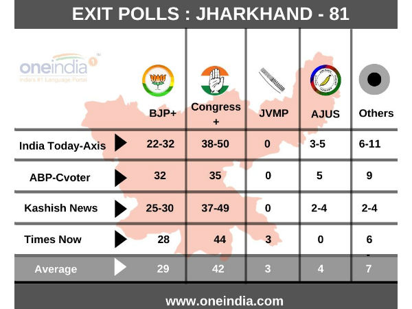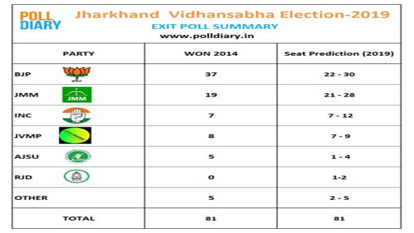 #EXITPOLL Jharkhand Legislative Assembly Election 2019 BJP: 27, JMM: 25, INC: 12, RJD: 03, AJSU: 04, JVM: 02 and Others: 08