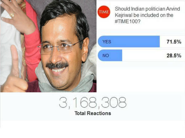 અરવિંદ કેજરીવાલ આ યાદીમાં પ્રથમ નંબર પર છે. ટાઇમ મેગેજીન વિશ્વના 100 પ્રભાવશાળી લોકોને પસંદ કરવા માટે ઓનલાઇન વોટીંગ કરાવી રહ્યું છે. આ યાદીમાં દુનિયાના રાજકારણીઓ, મીડિયાના જાણીતા ચહેરાઓ સહિત અન્ય ક્ષેત્રો સાથે જોડાયેલા દિગ્ગજ લોકોનો સમાવેશ કરવામાં આવ્યો છે. આ ઓનલાઇન વોટીંગમાં લોકપ્રિયતામાં અરવિંદ કેજરીવાલ અત્યાર સુધી બધા પર ભારે પડી રહ્યાં છે. આ વોટીંગમાં નરેન્દ્ર મોદી નાપસંદ કરવામાં આવ્યા લોકોની યાદીમાં બીજા નંબર પર છે. તેમને વોટ કરનાર કુલ લોકોમાંથી લગભગ 62 ટકાએ નાપસંદ કર્યા છે.
