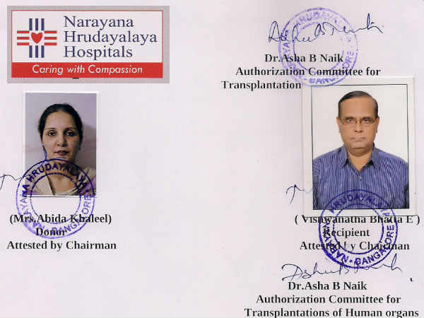નારાયણ હોસ્પિટલના ડોક્ટરોને બંનેએ પોત-પોતાના રિપોર્ટો બતાવ્યા અને સૌભાગ્યથી આબિદાનું બ્લડ ગ્રુપ વિશ્વનાથ સાથે અને ઉષાનું બ્લડગ્રુપ અબ્દુલ ખલીલ સાથે મેચ થતું હતું. નારાયણ હોસ્પિટલમાં 1 ઑગસ્ટના રોજ બંનેની કિડની ટ્રાંસપ્લાંટ કરવામાં આવી.