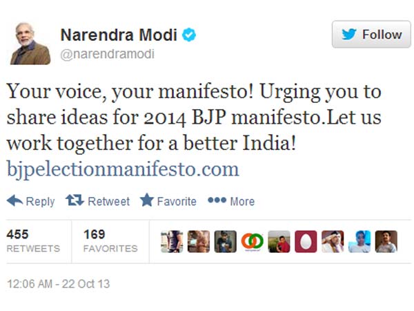 નરેન્દ્ર મોદીએ પોતાના ટ્વિટર એકાઉન્ટમાં બીજેપીઇલેક્શનમેનિફેસ્ટો http://www.bjpelectionmanifesto.com નામની આ વેબસાઇટ પણ આપેલી છે આ વેબસાઇટ પર જઇને આપ પણ બીજેપીના ચૂંટણી ઢંઢેરા માટે સૂચનો આપી શકો છો. આપ અહી પોતાનું નામ, ઇમેઇલ આઇડી, કેટેગરી આપ્યા બાદ 500 શબ્દોમાં પોતાનો સૂજાવ આવી શકશો.