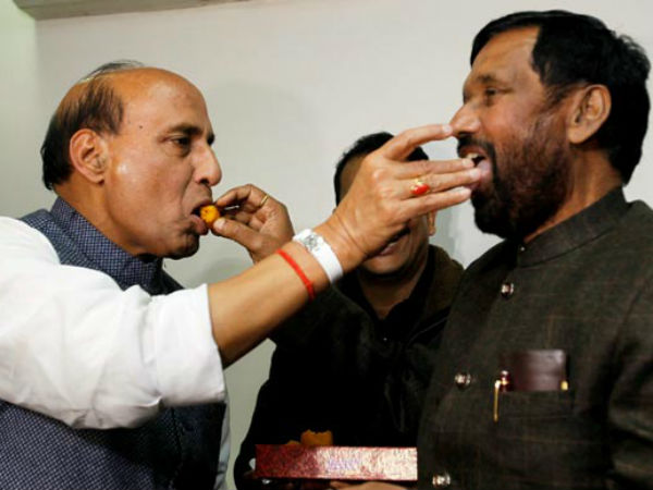 નવી દિલ્હી, 28 ફેબ્રુઆરી: બરોબર 12 બાદ ફરી એકવાર લોક જનશક્તિ પાર્ટીના અધ્યક્ષ રામવિલાસ પાસવાને એનડીએનું દામન પકડી લીધું છે. ગુરૂવારે સાંજે ભાજપના રાષ્ટ્રીય અધ્યક્ષ રાજનાથ સિંહ અને લોજપા અધ્યક્ષ રામવિલાસ પાસવાને અશોક રોડ સ્થિત રાજનાથ સિંહના નિવાસ પર એક સંયુક્ત પત્રકાર પરિષદમાં ભાજપ-લોજપા ગઠબંધનની જાહેરાત કરી. રાજનાથ સિંહે કહ્યું હતું કે આ ગઠબંધનથી બિહારમાં બંને દળોને ફાયદો થશે. બિહારમાં જે 7 સીટો પર લોજપાની સાથે ચૂંટણી ગઠબંધન થયું છે તેમાં હાજીપુર, જમુઇ, સમસ્તીપુર, વૈશાલી, ખગડિયા, મુંગેર અને નાલંદાનો સમાવેશ થાય છે.