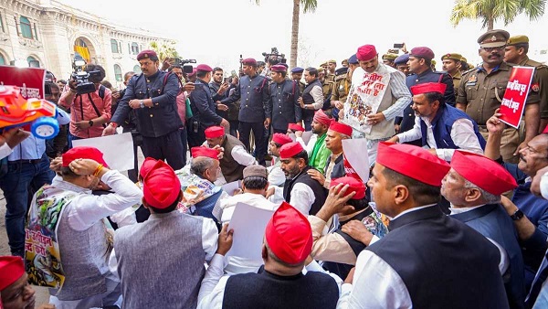 ઉત્તર પ્રદેશ વિધાનસભા સત્રની શરુઆત પહેલા વિરોધ પક્ષે સરકાર સામે વિરોધ કર્યો હતો. સમાજવાદી પાર્ટીના ધારાસભ્યએએ પ્રદર્શ કર્યુ હતુ.