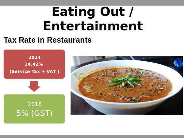 જીએસટીને કારણે, ડાઇનિંગ આઉટ વધુ સસ્તું છે. એસી અને નોન-એસી રેસ્ટોરાં બંને પર ગુડ્સ અને સર્વિસ ટેક્સ (જીએસટી) ની વસૂલાત 14.22 ટકાથી ઘટીને 5 ટકા થઈ છે. ગુવાહાટીમાં 23 મી બેઠકમાં જીએસટી કાઉન્સિલે ટેક્સ રેટ 14.22 ટકાથી ઘટાડીને ફક્ત 5 ટકા કરી દીધો હતો.