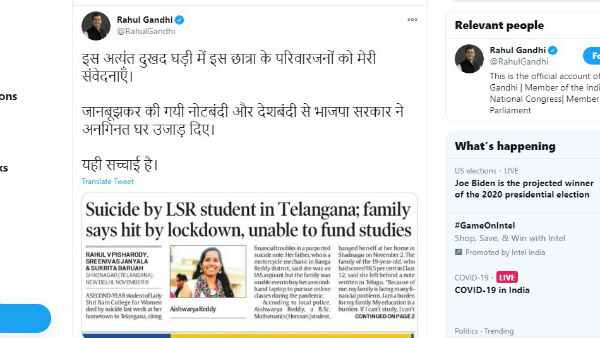 કોંગ્રેસ નેતા રાહુલ ગાંધીએ ફરી એક વખત 'સરકાર' અને 'દેશબંધી' માટે મોદી સરકાર પર નિશાન સાધ્યું છે, તેમણે એક ટ્વિટર એકાઉન્ટ પર એક સમાચારોનો સ્ક્રીનશોટ શેર કર્યો છે, જેમાં કહેવામાં આવ્યું છે કે શ્રી રામ કોલેજના એક આશાસ્પદ વિદ્યાર્થીએ આત્મહત્યા કરી લીધી છે. 'લોકડાઉન' ને કારણે થતી આર્થિક તંગીને કારણે, તેમની શિક્ષણ ફી તેમના પરિવાર માટે એક ભારણ બની હતી, રાહુલ ગાંધીએ ટ્વિટર પર લખેલા સમાચાર પર ઉંડી વ્યથા વ્યક્ત કરી હતી કે આ ખૂબ જ દુ ખદ ક્ષણમાં આ વિદ્યાર્થીના પરિવારના સભ્યો ભાજપ સરકાર પ્રત્યેની મારી સંવેદના, ઇરાદાપૂર્વક 'ડિમોનેટાઇઝેશન' અને 'દેશબંધી' દ્વારા, કેટલાય લોકોના ઘર ઉજાડી દીધા છે. રાહુલ ગાંધીનું આ ટ્વીટ સોશિયલ મીડિયા પર વાયરલ થઈ રહ્યું છે.