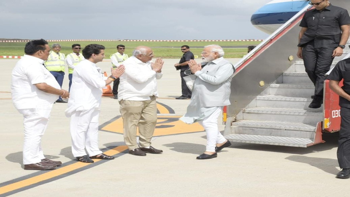 PM મોદીનું રાજકોટ ઇન્ટરનેશનલ એરપોર્ટ ખાતે ભવ્ય સ્વાગત કરાયું